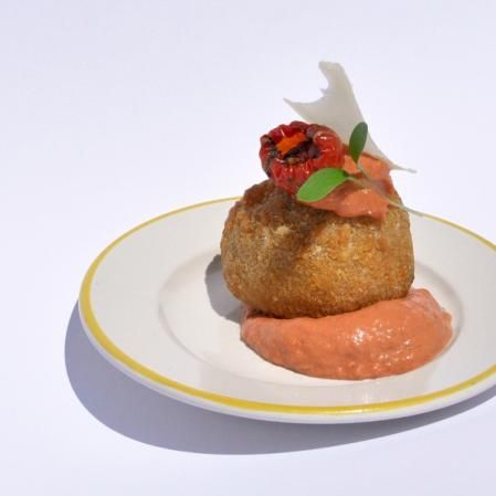 “Arancino” de espárragos con mayonesa de tomate confitado.