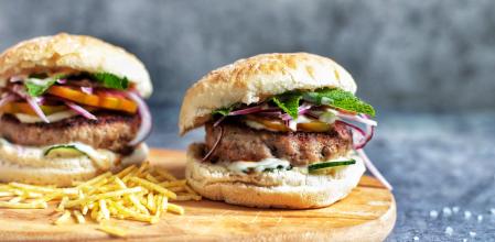 Ana Casanova nos propone una hamburguesa de carne de cordero con cuscús y ajo, jugosa y llena de matices. Se acompaña con menta fresca, cebolla y rodajas de tomate, y se corona con una deliciosa salsa de yogur que realza todos los sabores.