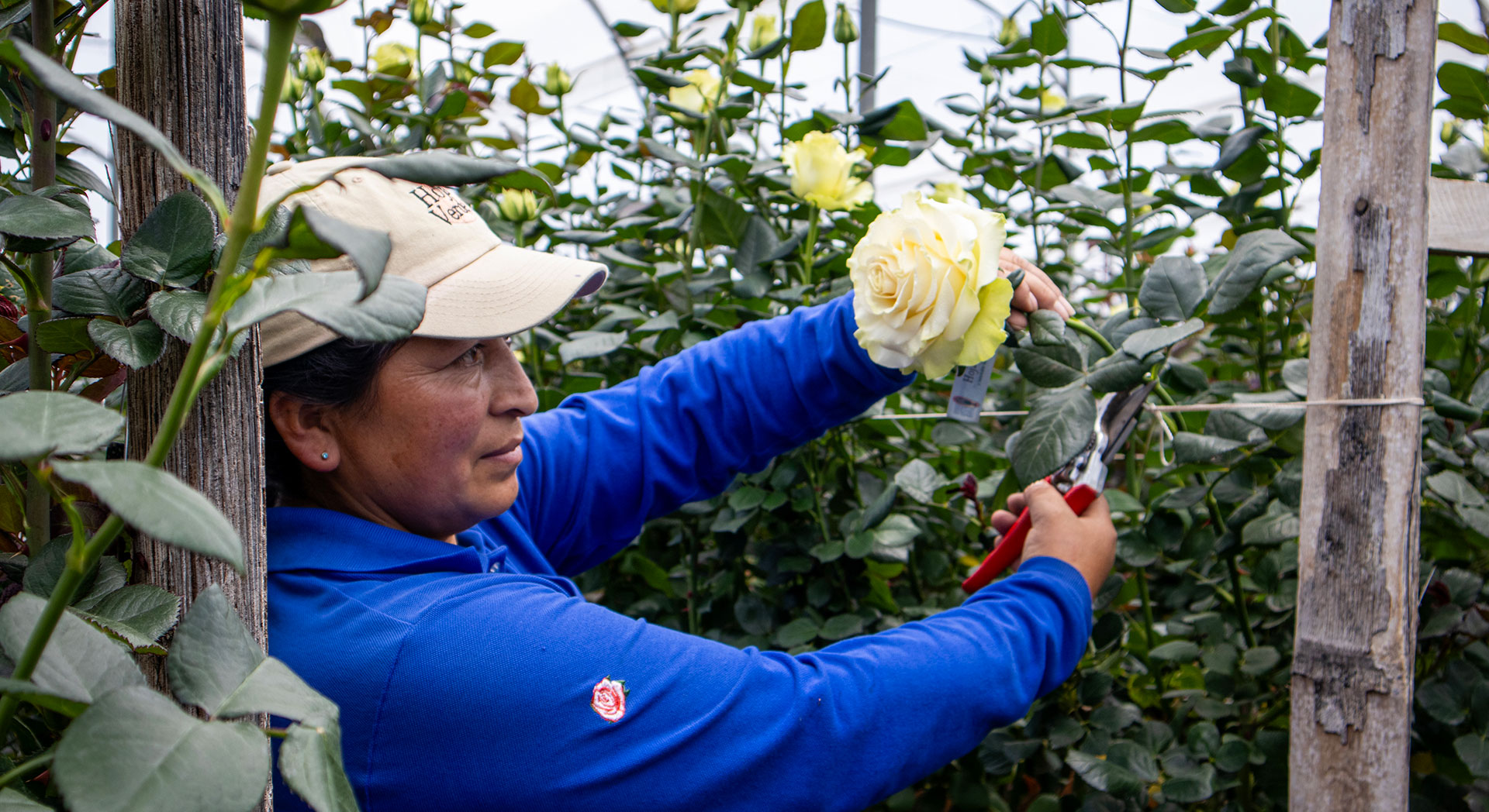 Una empleada cosecha rosas en el invernadero de la plantación de rosas de la granja Hoja Verde (Joselyn Gutiérrez)