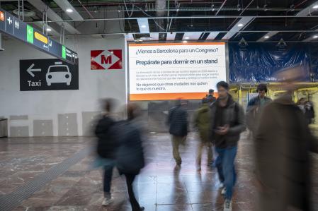 Una campaña publicitaria en catalán, castellano e inglés en espacios exteriores estratégicos como la estación de Sants y el aeropuerto de El Prat, así como en medios de comunicación generalistas, económicos y publicaciones dirigidas a pasajeros de aerolíneas y trenes de alta velocidad –incluida la revista oficial del Mobile World Congress–lanza un mensaje muy directo al visitante: “¿Vienes a Barcelona para un congreso? Prepárate para dormir en un stand”.