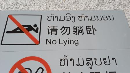 "Prohibido estirarse". Cartel trilingüe en la estación de Luang Prabang