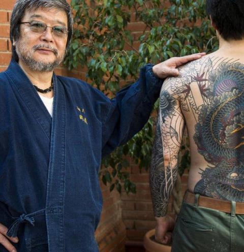 Es menudo y sonriente, y los tatuadores le consideran un gran maestro. “Con pocos colores, consigue grandes efectos, profundidad, dinamismo”, me comentan los que saben. Llega acompañado por uno de sus discípulos, que se descamisa para mostrar la obra en marcha de su maestro en la espalda: serán cinco años de paciente trabajo. Uno de los tobillos del maestro muestra marcas de colores, puntos, cuadrados: pruebas de pigmentos en su propia piel. Viene a la convención internacional de tatuaje de Barcelona (hasta el domingo): presenta su libro Horitoshi I, la historia del Irezumi (así llaman al tatuaje), y a la proyección de un documental sobre su trabajo.