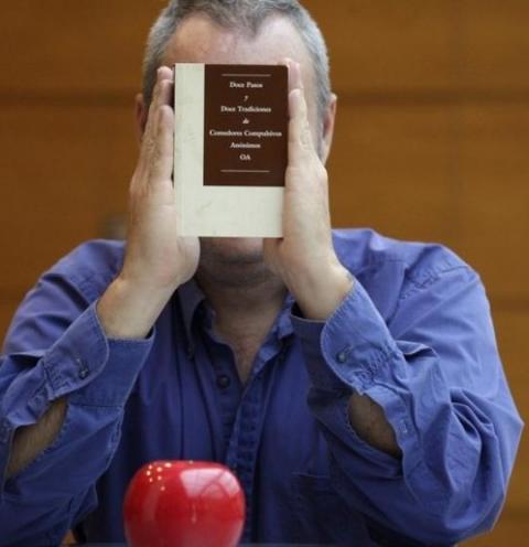 Me explica que no todos los comedores compulsivos están gordos, porque muchos se purgan con laxantes o vomitan, "¡pero están hechos polvo en lo emocional y espiritual!", dice Juanjo. Él está en línea en lo físico, sin bajar la guardia en su actitud respetuosa hacia sí mismo y en su relación con la comida. Como portavoz de Comedores Compulsivos Anónimos (Comedorescompulsivos.es), insiste en dar su teléfono: 619-857-915. "¡Quiero ayudar, sé lo que se sufre con esto!". La asociación no pide a nadie ni su identidad, ni su dinero, ni sus creencias. Quiere fotografiarse sin mostrar el rostro, con el manual de pautas para recuperar una relación sana con la comida.