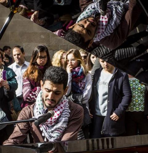 Puede verlo en YouTube: en una calle de Damasco destrozada por las bombas, solitaria, un hombre con un viejo piano canta una canción desgarradora. Eso es lo que hizo Ahmad durante cuatro años, sacar su piano a la calle con una vieja carretilla y tocar. Sus letras hablan de cómo se vive bajo las bombas, de la pérdida de las raíces, de los refugiados, del sueño de volver a casa... Él lo tiene feo: un palestino sin tierra, un sirio sin pasaporte, hoy un refugiado en Alemania tras padecer la ruta de los Balcanes: “Pagué 10.000 euros, 3.000 me los dio un periodista alemán que conocí por Skype”. Hoy recorre el mundo dando conciertos, pidiendo solidaridad. Ha actuado en la plaza del Rei invitado por la Associació Catalana per la Pau.