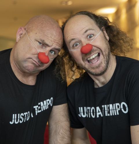 Celebran veinte años juntos y ocho espectáculos. La crisis les llevó a abrir un bar pero la creatividad siguió fluyendo e inventaron un nuevo formato que ellos llaman conferencia teatralizada: la idea era poder ofrecer espectáculos sencillos de montaje a las empresas que se los requerían como Ikea, distintos hospitales, el BBVA, La Caixa... Así nació Mejor es posible, una guía infalible para alcanzar la felicidad a base de buen humor que acabó llenando teatros. Ahora, apadrinados por Tricicle llegan al teatro Poliorama (hasta el 2 de junio) con Justo a tiempo dirigidos por Fernando Fabiani, en que disertan sobre nuestra relación con el tiempo y nos proponen sus claves para gestionarlo desde el humor pero con sabiduría.