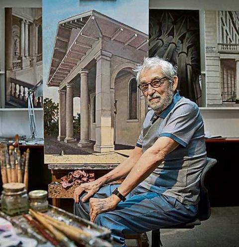 Oscar Tusquets ha trabajado siempre con líneas y planos, con formas y volúmenes..., y yo le he descubierto en sus palabras. Cada una de sus frases, las escritas en sus brillantísimos ensayos – Más que discutible –, despliega ideas sagaces y sugestivas, osadías certeras, inspiraciones hondas, bellas y luminosas sacudidas. Descendemos a su taller de pintor, para la foto, y me arroban la luz y las perspectivas de sus pinturas con detalles arquitectónicos (Bernini, Borromini, Acrópolis, Sunión...). Su último libro, Pasando a limpio es un admirable catálogo de ideas restallantes sobre arte y belleza. Lo abro y transcribo una: “Lo muy bello, a veces, asusta más”.
