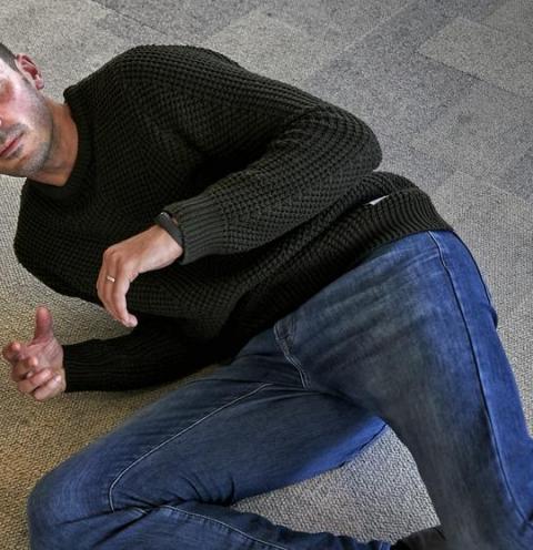 Y una vez en el suelo, voy rotando mi cuerpo pausadamente..., y apoyo una palma de la mano en el suelo..., y luego la otra...