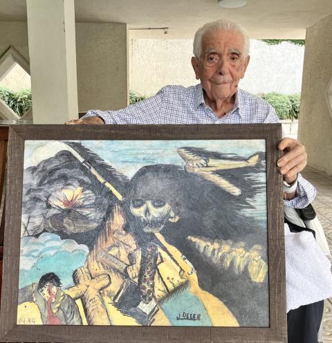 Desde 1938, Oller ha tenido pesadillas sobre la batalla del Ebro. Donó al museo de Fayón el óleo en el que las plasmó tras desertar de aquel infierno (una copia es la que me muestra en la foto). Es un superviviente, tal como cuenta en sus memorias Vivencias de Quim (Buenas Letras). Tras la guerra fundó una industria de resinas sintéticas (Fers Resins) en la que se volcó hasta ser absorbida por la multinacional japonesa Sumitomo Chemical en el 2003. Si Oller cierra los ojos, vuelve al Ebro, donde vio morir a tantos jovencitos como él llamando a sus madres. “Allí no vi políticos”, dispara, recordando las balas de los propios comisarios políticos. Me ayuda en la charla su hijo Quim (64), que desde chaval aprendió que desertar de la violencia, las armas y la guerra constituye un acto de amor a la vida.