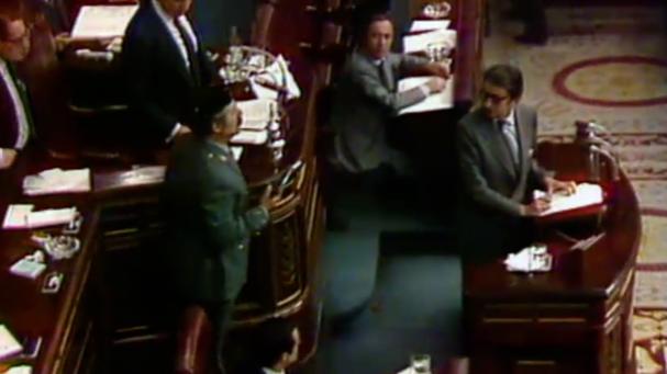 El teniente coronel de la Guardia Civil Antonio Tejero accede por la fuerza encabezando a 200 guardias civiles en el interior del Congreso, mientras se realizaba la votación de Leopoldo Calvo Sotelo como nuevo presidente del gobierno