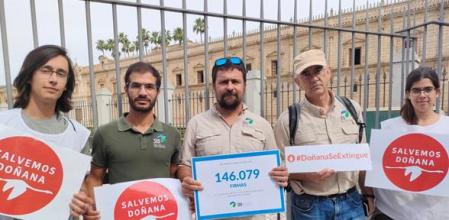 Representantes de la organización conservacionista SEO/BirdLife, vinculada a Doñana desde sus orígenes en 1954 a través de las primeras campañas científicas y de anillamiento, registró este miércoles en el Parlamento de Andalucía un total de 146.079 firmas de personas contrarias a la propuesta del PP y Vox de legalizar regadíos en el entorno de ese parque nacional.