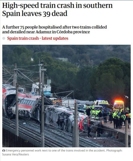 En Reino Unido, The Guardian destaca también la información en su portada digital, con un artículo y una cobertura en directo. Además de la víctima de fallecidos, que aumenta mientras “continúan los esfuerzos de rescate”, el rotativo británico señala que “otras 75 personas fueron hospitalizadas tras el choque y descarrilamiento de dos trenes cerca de Adamuz”.