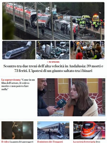 Los medios italianos también cubren la información con todos sus recursos en las primeras posiciones de sus páginas web. El Corriere della sera, con una amplia cobertura, cubre la información con más de seis artículos y reportajes, en los que destaca las “dudas” del ministro Oscar Puente ante la posible causa del siniestro, que apuntan podría ser “una rotura de la unión entre vías”. Además, también destacan el relato de los supervivientes en el “infierno en el tren de alta velocidad”: “Una frenada brusca y los asientos se desprendieron”