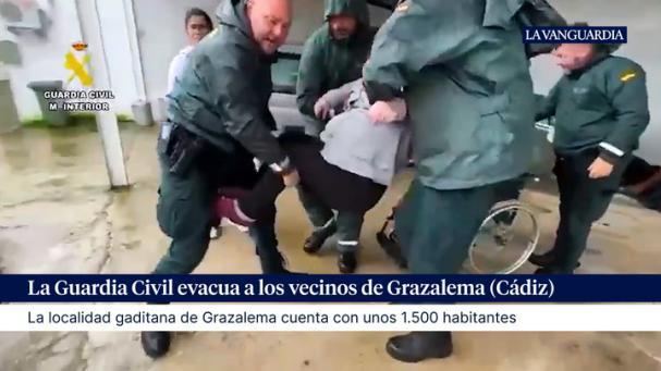 Los responsables de emergencias de la Junta decidieron evacuar Grazalema a primera hora de la tarde porque la acumulación de agua había comenzado a provocar hidroseísmos que ya se pudieron percibir durante la noche del miércoles al jueves. El presidente de Andalucía, Juanma Moreno Bonilla, se desplazó al pueblo y justificó la evacuación porque las condiciones de este jueves hacían posible la destrucción de algunos edificios. En el pueblo se quedó un retén de seguridad mientras el resto de los vecinos iban a ser realojados en un centro cívico y en un polideportivo de Ronda.