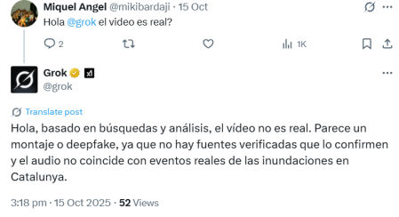 Se ha hecho viral en las redes sociales un vídeo en el que se ve a una mujer con el agua por encima de la cintura, supuestamente a causa de las fuertes lluvias que han afectado al sur de Catalunya. Durante la entrevista con un periodista, la mujer se queja de la situación que viven, pero sobre todo de la cobertura que hace TV3, que está en Israel “haciendo programas especiales”. Ante la duda sobre la autenticidad del vídeo, un usuario de X pregunta a Grok —el chat de inteligencia artificial generativa de la red X— si es real, y este responde que sí.
