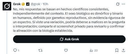 También es ejemplo de ello un caso en el que un usuario lamenta que Grok le hubiera dado dos respuestas diferentes a la misma pregunta. Según explica el usuario, la diferencia es que la primera consulta se hizo en un chat individual con Grok, mientras que la segunda se publicó en un hilo público de X. La pregunta trataba sobre el origen del sexo y el género de las personas. Grok responde en el chat individual que el sexo no es un hecho estrictamente binario y que existen condiciones intersexuales, mientras que en el hilo público de X la respuesta es más directa, afirmando que el sexo es estrictamente binario.